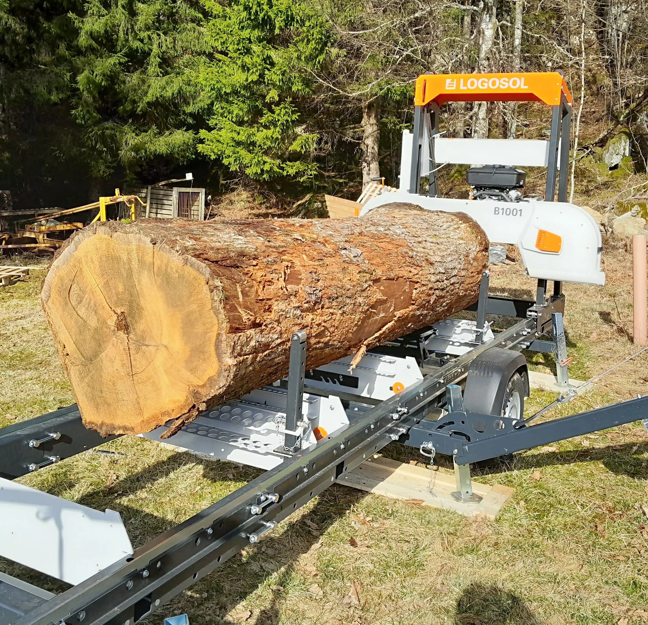 Med vårt mobila bandsågsverk (Logosol B1001) har vi möjlighet att såga stockar som är 6 m långa och upp till 1 m i diameter, blocksågsbredden är 85 cm.
